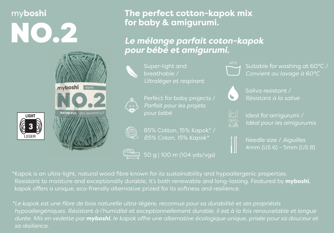 The perfect cotton-kapoc mix for babies & amigurumi. 50 g, 100 m (109 yds). Super-light and breathable. Ideal for amigurumi and perfect for babies. Saliva resistant. 85% Cotton, 15% Kapoc. Washable at 60 degrees. Needle size 4 - 5 mm.